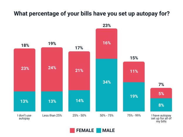 The most comfortable? Men. 71% of men say they are comfortable with autopay, compared to 43% of women. 61% of men are using autopay to pay half or more of their bills.