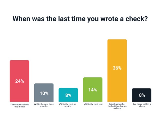 54% of people said they don’t remember the last time they wrote a check, have never done it, or they haven’t done it in the last year.